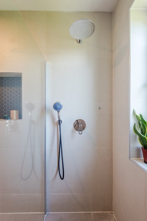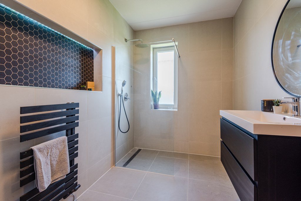 De badkamer is volledig betegeld en uitgerust met een inloopdouche, wastafelmeubel en hangend toilet. De verdieping is afgewerkt met een nette laminaatvloer.