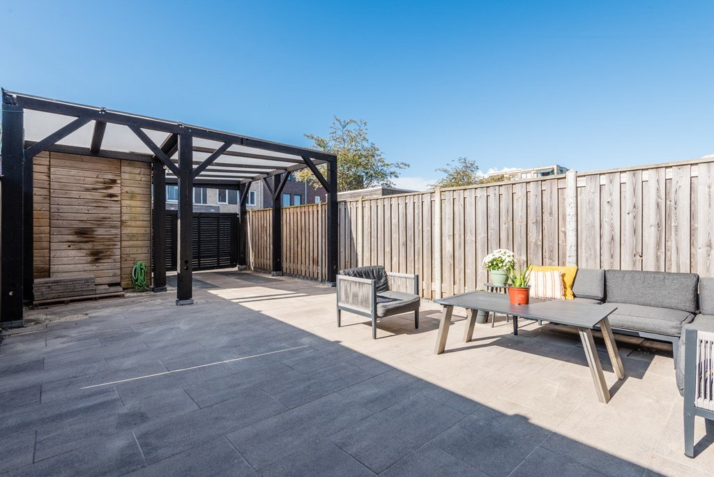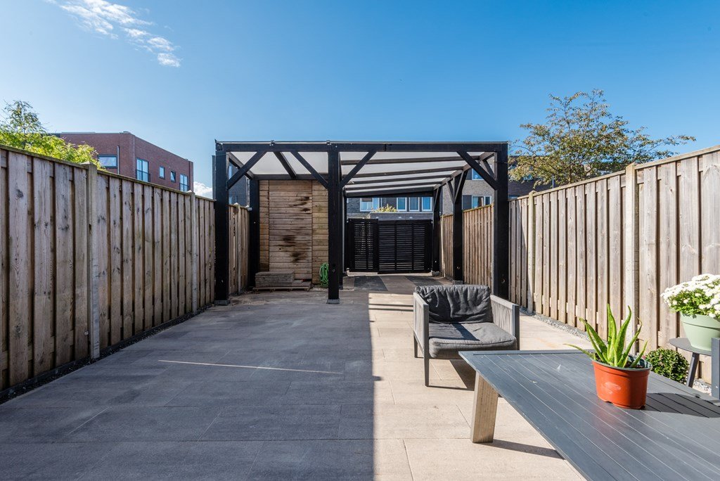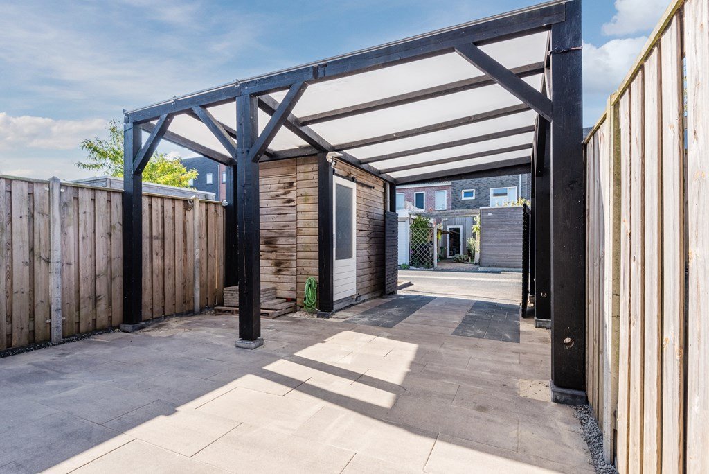 De ruime achtertuin ligt op het zuidwesten, waardoor u de hele dag van de zon kunt genieten. De tuin is onderhoudsvriendelijk aangelegd en beschikt over een carport, berging en overkapping. Perfect voor gezellige barbecues of ontspannen avonden buiten. Dankzij de achterom is de tuin goed bereikbaar.