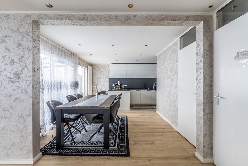 Vanuit de eetkamer is er toegang tot de hal met een separaat toilet en de trap naar boven.