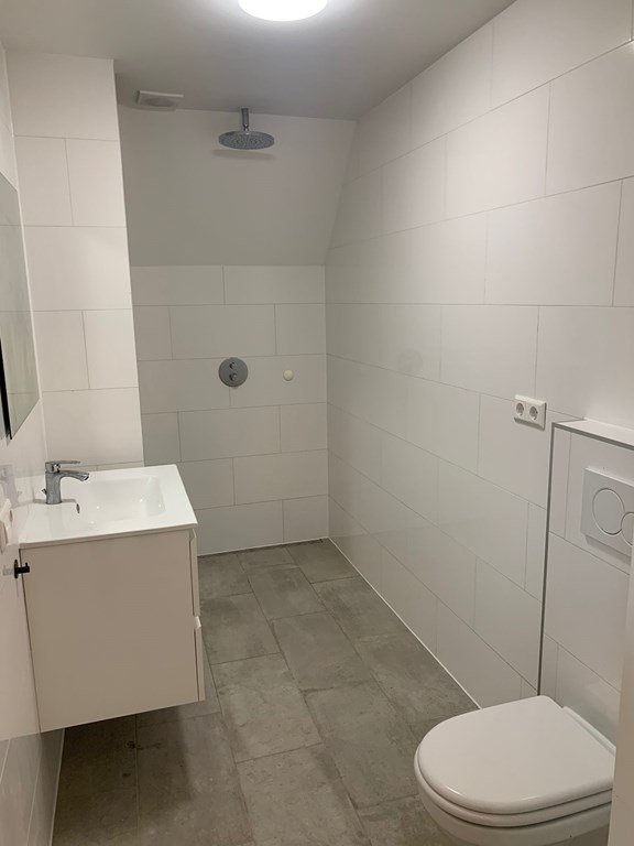 Badkamer: moderne afwerking met inloopdouche, wastafelmeubel en toilet